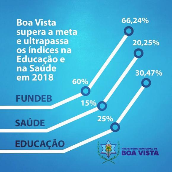 Após fechamento do balancete do mês de dezembro de 2018, a Prefeitura Municipal de Boa Vista, atestou que ultrapassou os percentuais de investimento exigidos pela Constituição Federal, sendo 25% para a Educação, 60% do FUNDEB para pagamento do magistério e 15% para investimentos na Saúde.