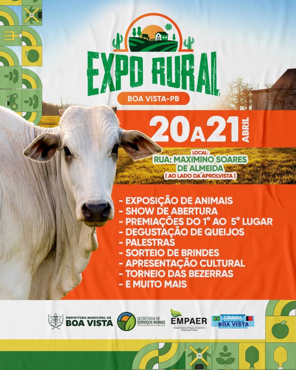 Boa Vista realiza nos dias 21 e 22, próximo sábado e domingo, através da Secretaria de Serviços Rurais, em parceria com a Câmara Municipal e a Empaer, a Expo Rural 2024, um grande evento com shows, apresentações culturais, palestras, degustações de queijos, sorteios, exposição de animais, premiações e até torneio das bezerras.