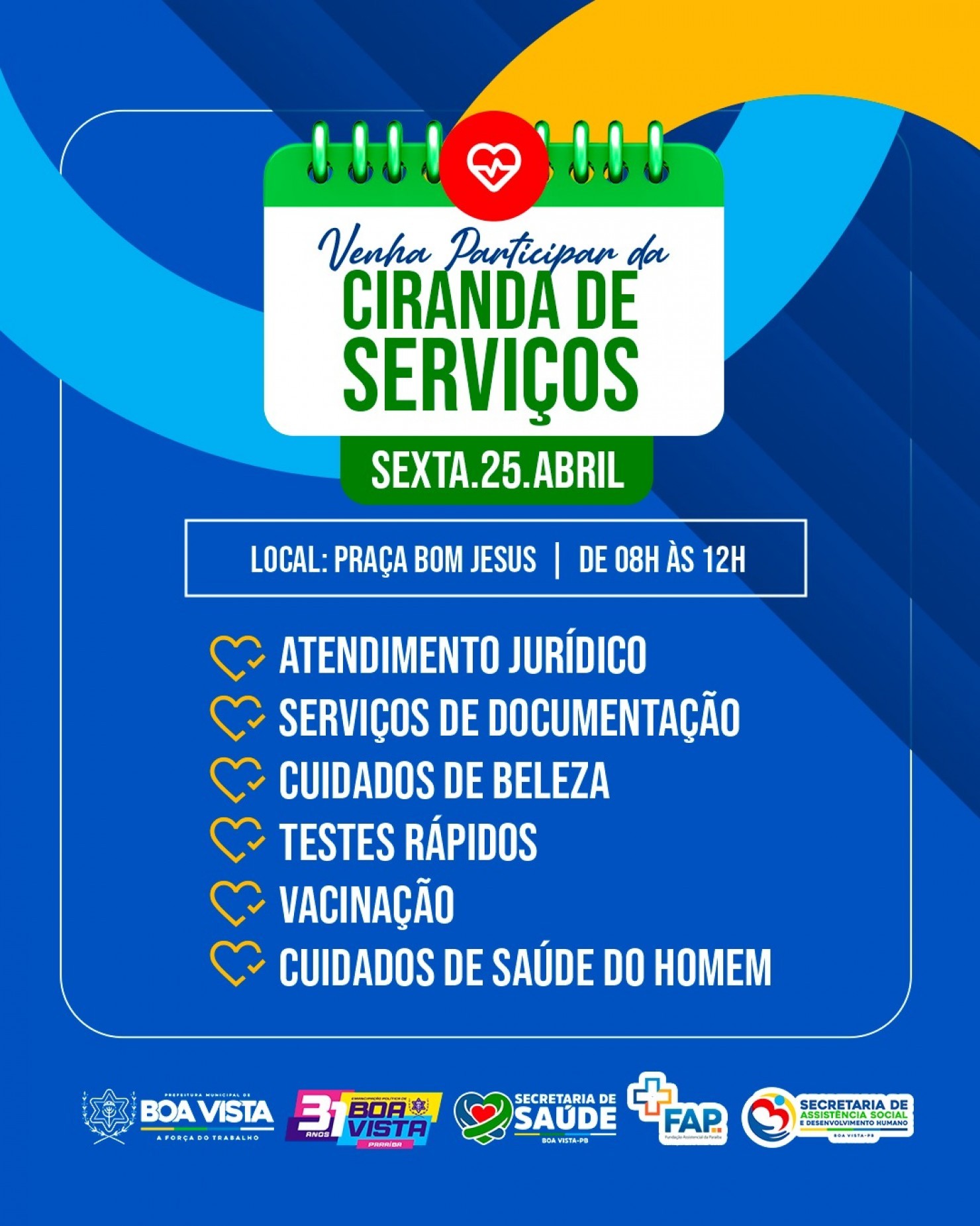 A Prefeitura realiza nesta sexta-feira (26), a partir das 8h, a primeira edição da Ciranda de Serviços, com atendimentos à população na Praça Bom Jesus. A ação integra as atividades de aniversário de 31 anos da cidade e tem como objetivo aproximar a população dos serviços públicos essenciais, promovendo cidadania, saúde e bem-estar para todos.
