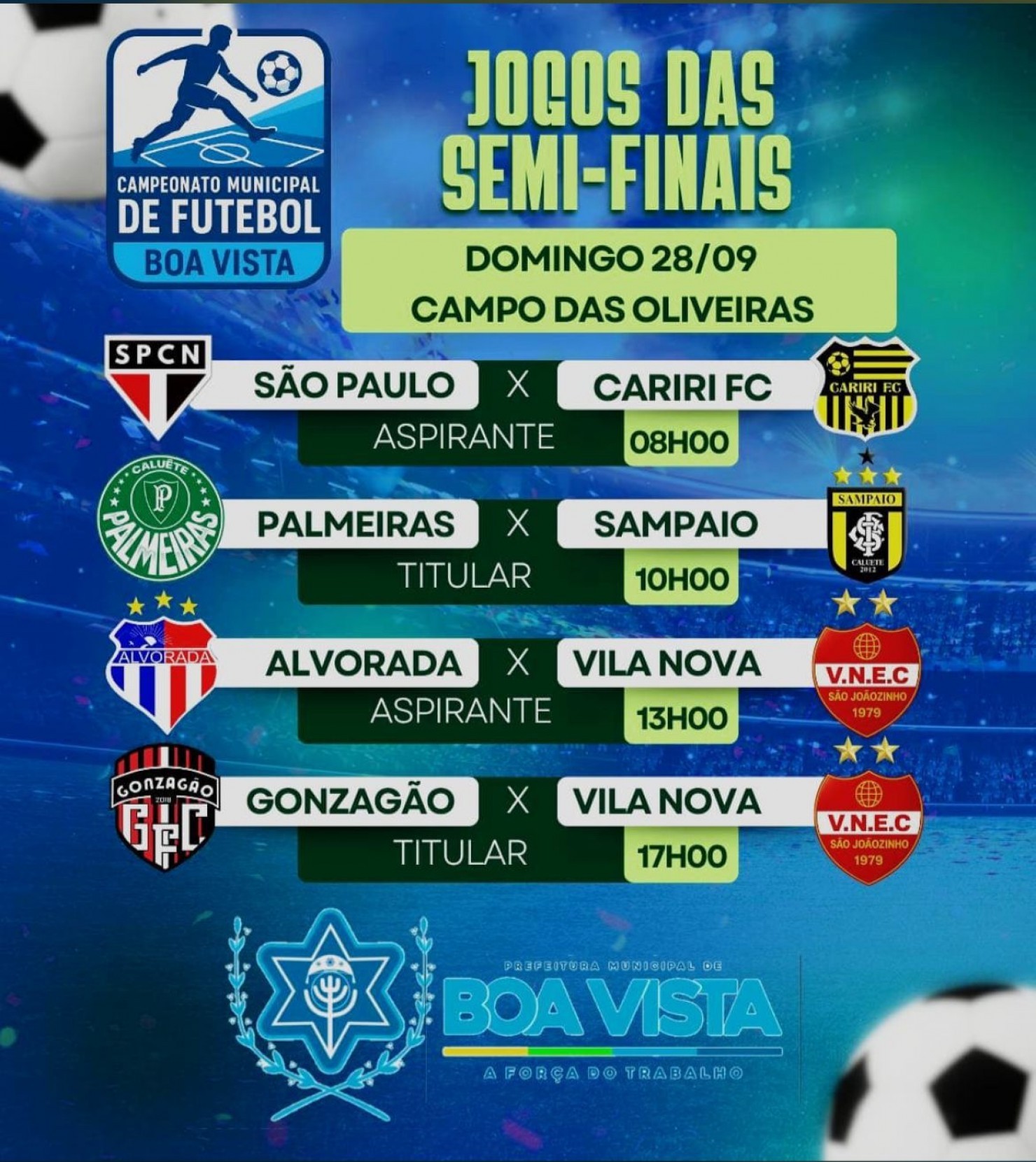 A Prefeitura de Boa Vista, por meio da Coordenadoria de Esportes, informa que as semifinais do Campeonato Municipal de Futebol serão realizadas neste domingo (28) no Campo das Oliveiras, com partidas nos turnos da manhã e tarde.